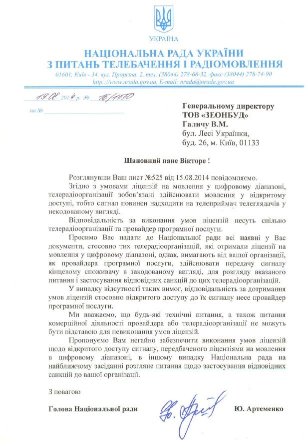 Позиция нацрады в письме - лучшая из возможных. Незачем Нацраду топить в технической части. Это "не их профиль".